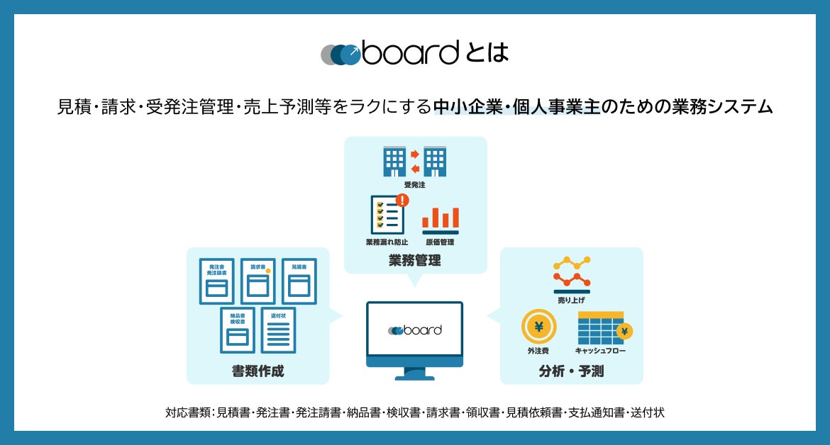 boardは、毎月発生する見積書・発注書・請求書等の書類作成や売上見込の管理などを通して、バックオフィス業務の効率化および経営に必要な数字の見える化を実現する、中小企業・個人事業主向けのクラウド型業務・経営管理システムです。