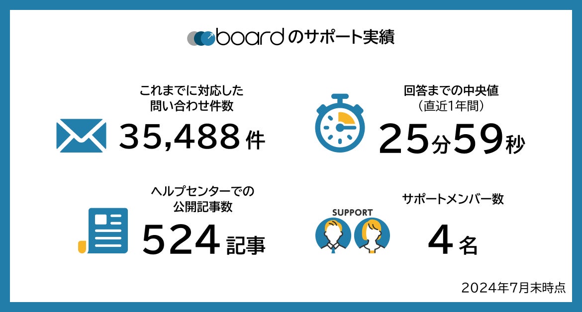 boardは2014年のリリース以降、これまでに35,000件以上のお問い合わせに回答してまいりました。この内、直近1年間における回答までの所要時間の中央値は25分59秒でした。