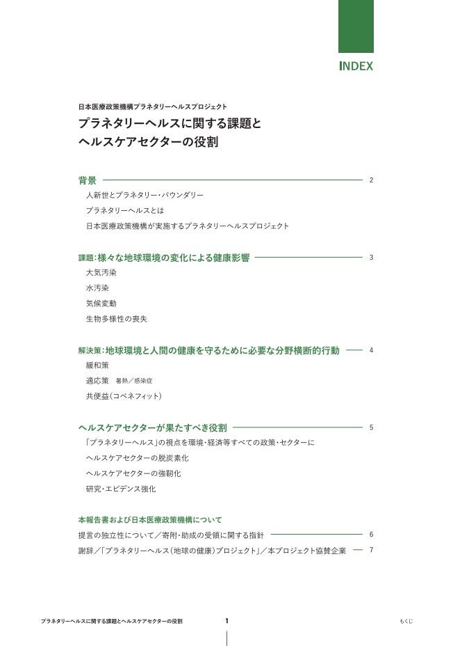 2023年5月13日~14日に開催されるG7長崎保健大臣会合および2023年11月30日~12月12日までの日程でアラブ首長国連邦(UAE)にて開催予定の国連気候変動枠組条約(UNFCCC)第28回締約国会議(COP28)において、初めて健康問題を深く議論するための日程が設けられる中で、気候変動・生物多様性の喪失・環境汚染などの地球規模の課題と人類の健康について議論するうえでヘルスケアセクターの役割について理解を深める一助となれば幸甚です。