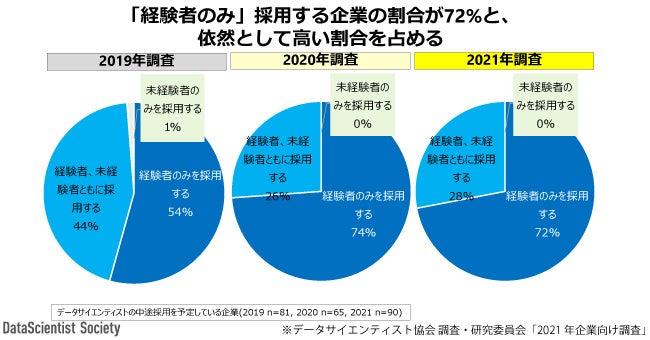 - 中途採用では「経験者のみ」を採用する企業の割合は72%と昨年から続いて高い水準