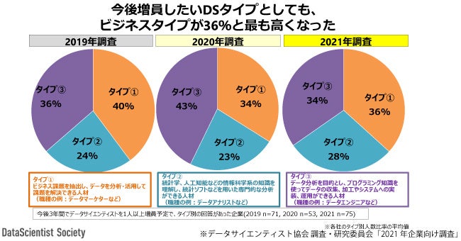 - 今後増員したいDSのタイプとしては、ビジネスタイプが36%、アナリストタイプが28%、エンジニアタイプが34%