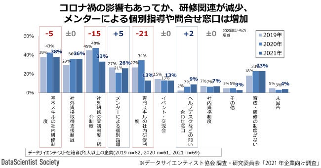 - DS人材の育成・研修制度として、社内外の研修制度を提供している企業が減少
