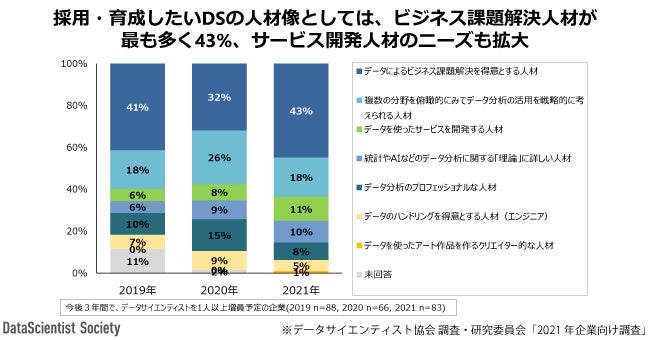 - 今後、採用・育成したいDSは「ビジネス課題解決を得意とする人材」が最も多く43%で過去最高水準