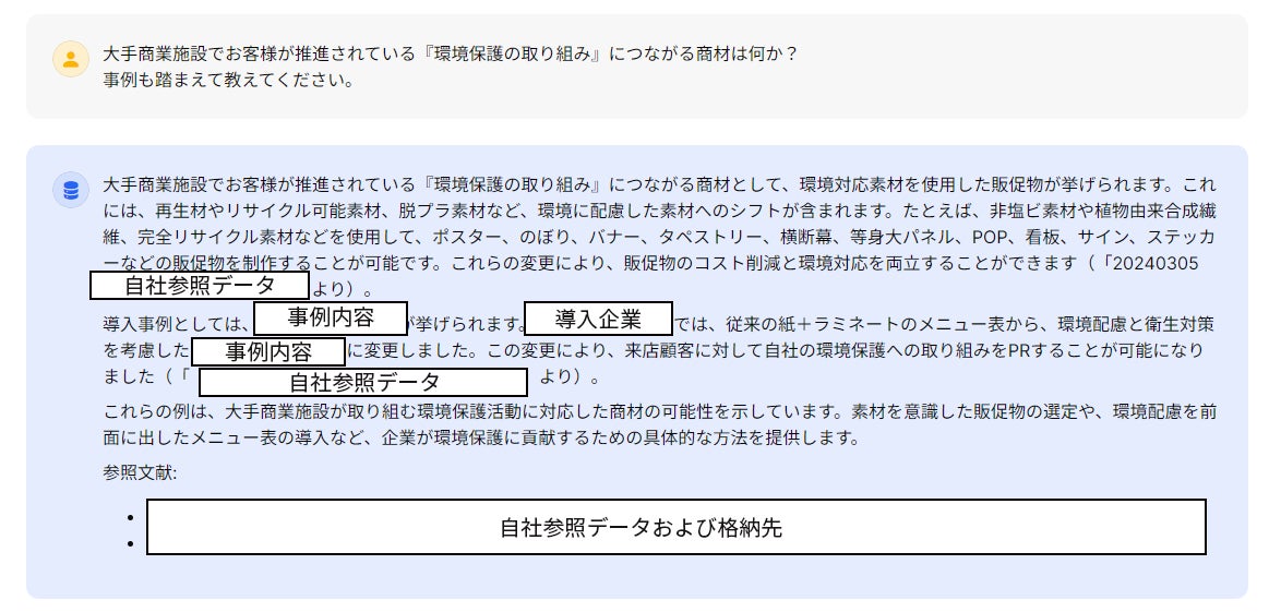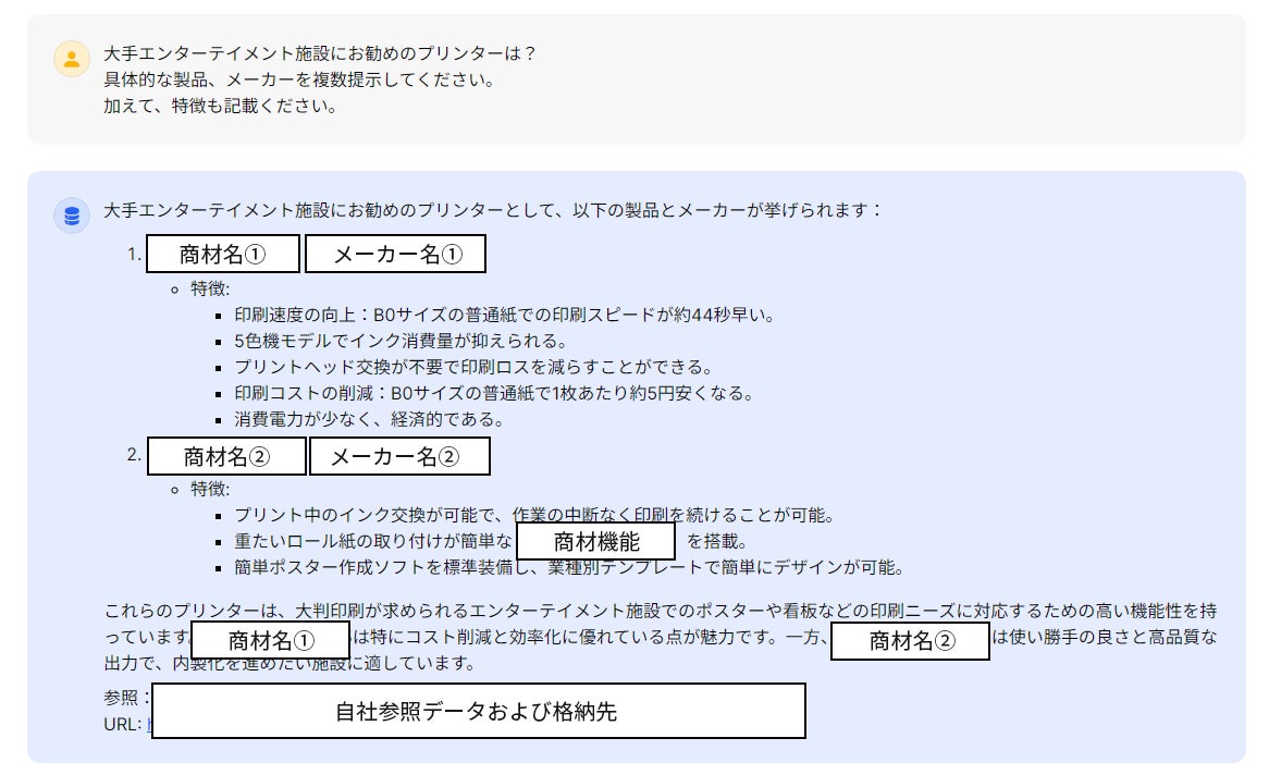 exaBase 生成AIの「自社データとの連携機能」を活用し、当社が販売する500点を超える専門印刷機器の詳細な商品情報と導入事例情報を取り込みました。これにより、営業人員の個々人の習熟度や暗黙知に依存することなく、営業全員がお客様からのご依頼に対し、あらゆる商品群の中から最適な商品のご提案が可能となりました。