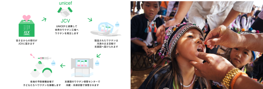 事業内容 | 1日 4,000人と言われている、世界でワクチンがないために感染症で命を落とす子どもたち。5 歳未満で亡くなる子どもの約3人に1人はワクチンで予防可能です。JCV はこの子どもたちの命を救うため開発途上国にワクチンを贈り、子どもたちの未来を守る活動を行う民間の国際支援団体です。支援者の皆さまからお預かりした寄付をワクチンや関連機器に換え、現地の国連児童基金(UNICEF)事務所及び現地政府と連携して毎年支援国の子どもたちに届けています。2021 年はミャンマー、ラオス、ブータン、バヌアツの 4 カ国に1億1,641万7,060円分の⽀援を実施しました。 |