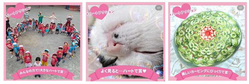 キャンペーンで投稿された、ペットのハートマーク模様、大好きな芸能人のハートポーズ、キャンペーンのために制作したカービングなど、様々なハートの写真や動画と一緒に、