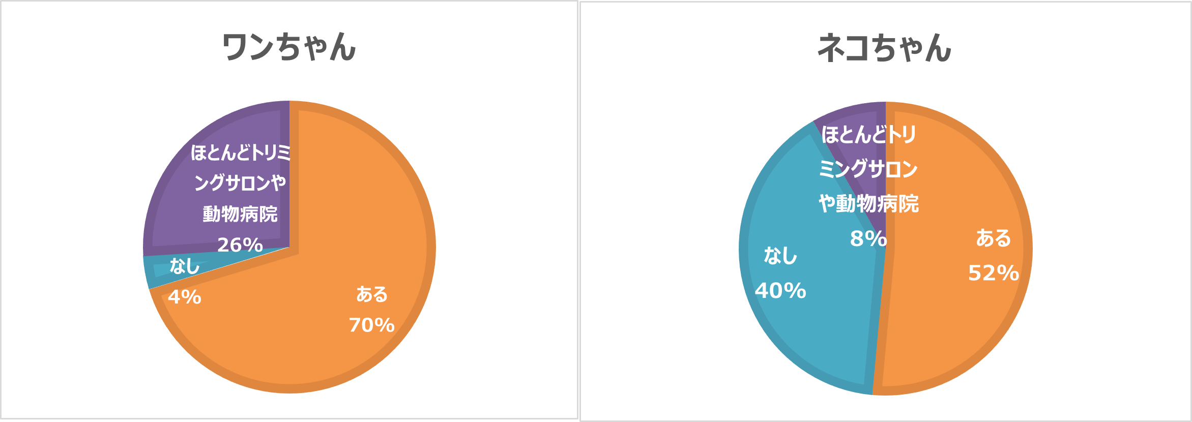 犬の飼い主:「ある」が70%、「なし」が4%、「トリミングサロンや動物病院」が26%