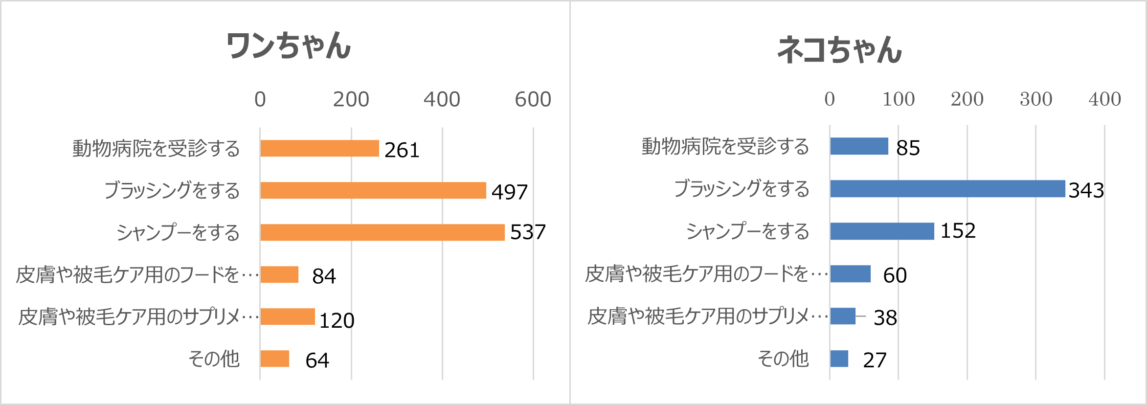 ・具体的なケア方法1位:【犬】シャンプー、【猫】ブラッシング