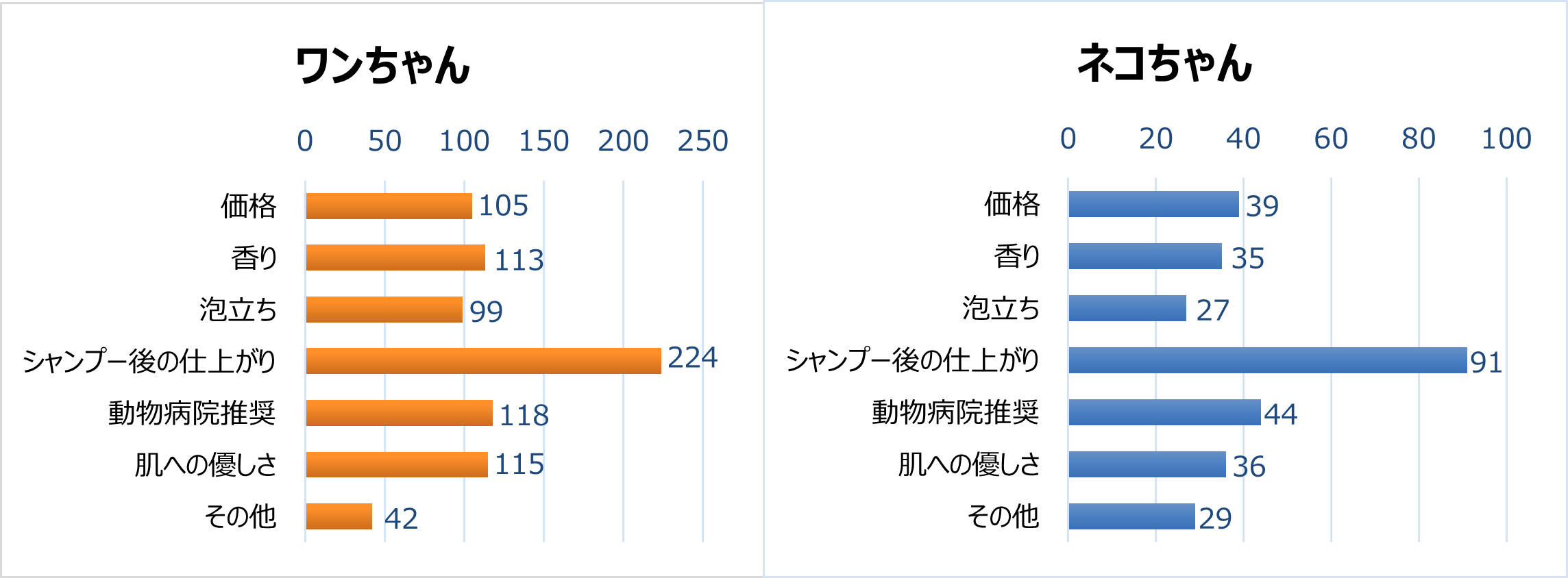 ・シャンプーで重視すること上位:【犬・猫共通】1位「シャンプー後の仕上がり」が最多、2位「動物病院推奨」