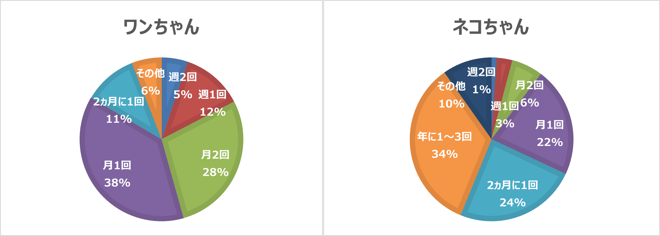 犬の飼い主:「月1回程度」が38%、「月2回程度」が28%、「週1回」が12%
