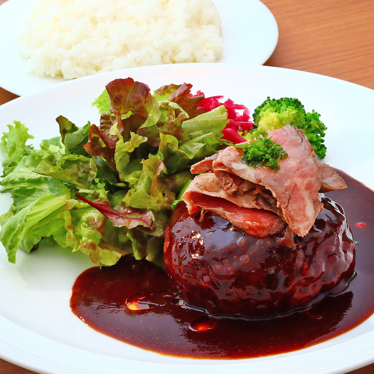 肉×肉のボリューミーなメニューです!ランチタイムではライスセット、ディナータイムでは単品も。肉汁あふれるジューシーなハンバーグと、旨味がギュッと凝縮されたローストビーフを一度に楽しめる、満足度の高い一品です。