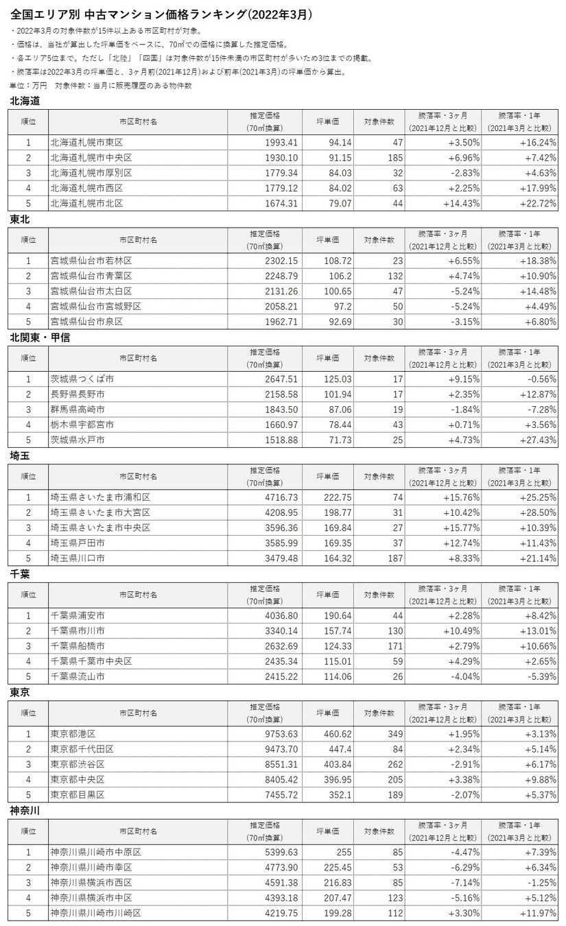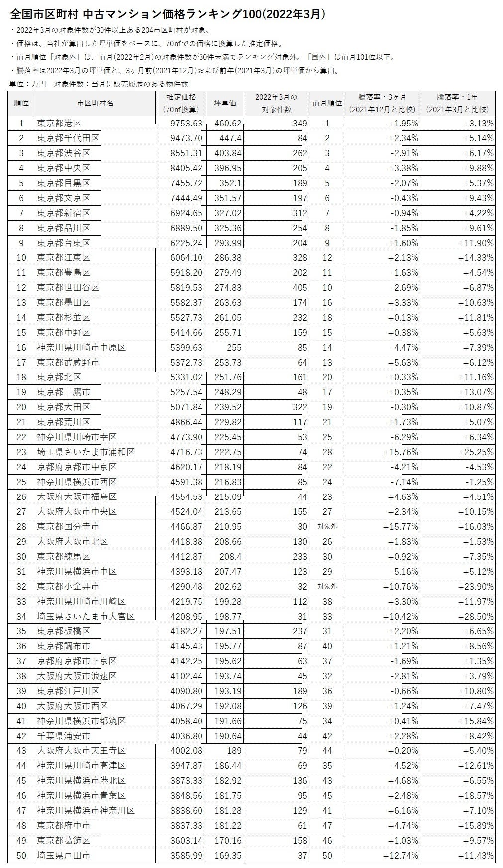 「マンションレビュー」2022年3月 全国市区町村 中古マンション価格/騰落率ランキング100