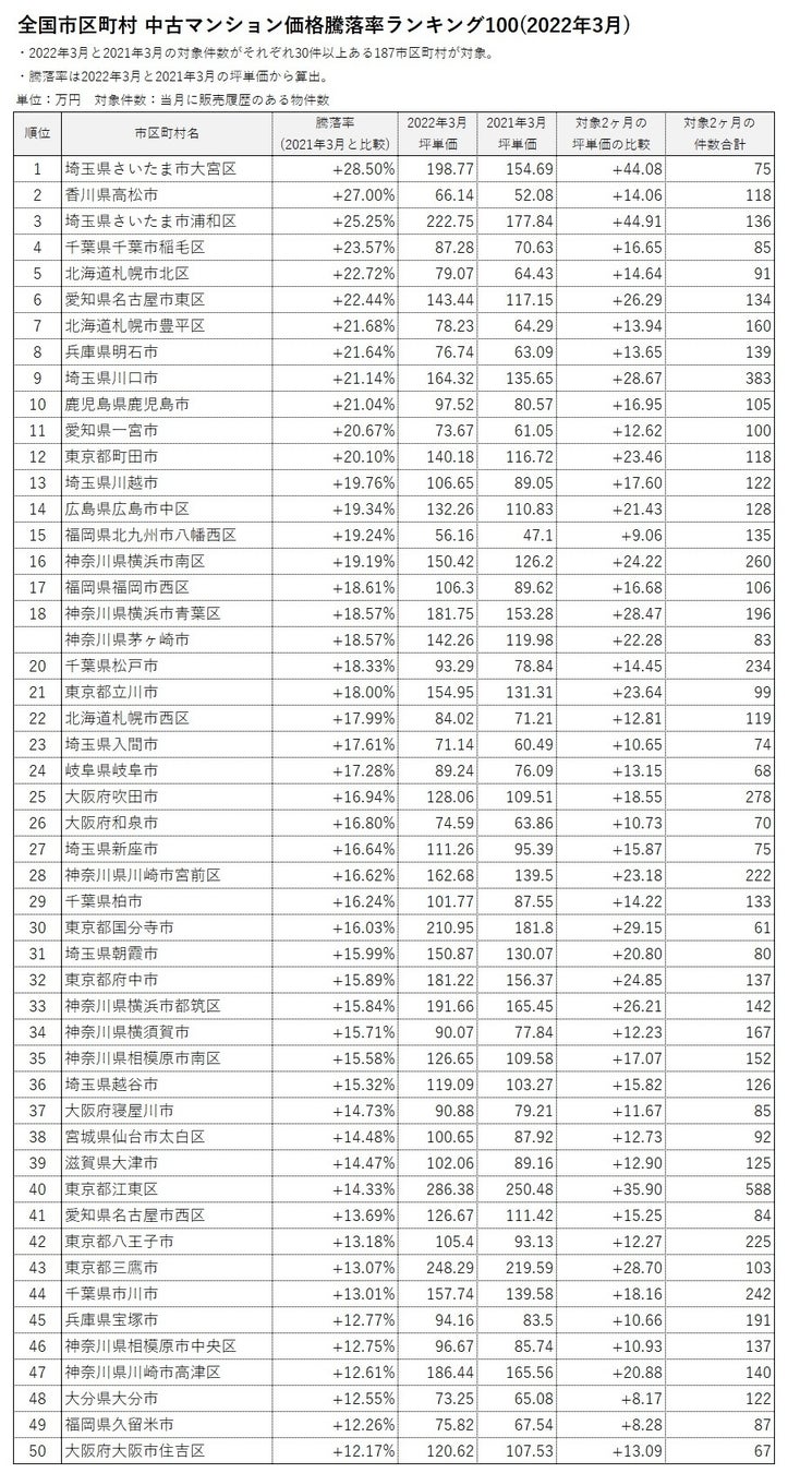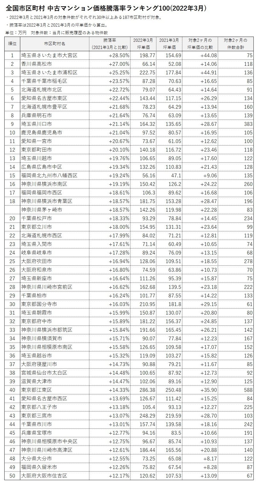 「マンションレビュー」2022年3月 全国市区町村 中古マンション価格/騰落率ランキング100を発表
