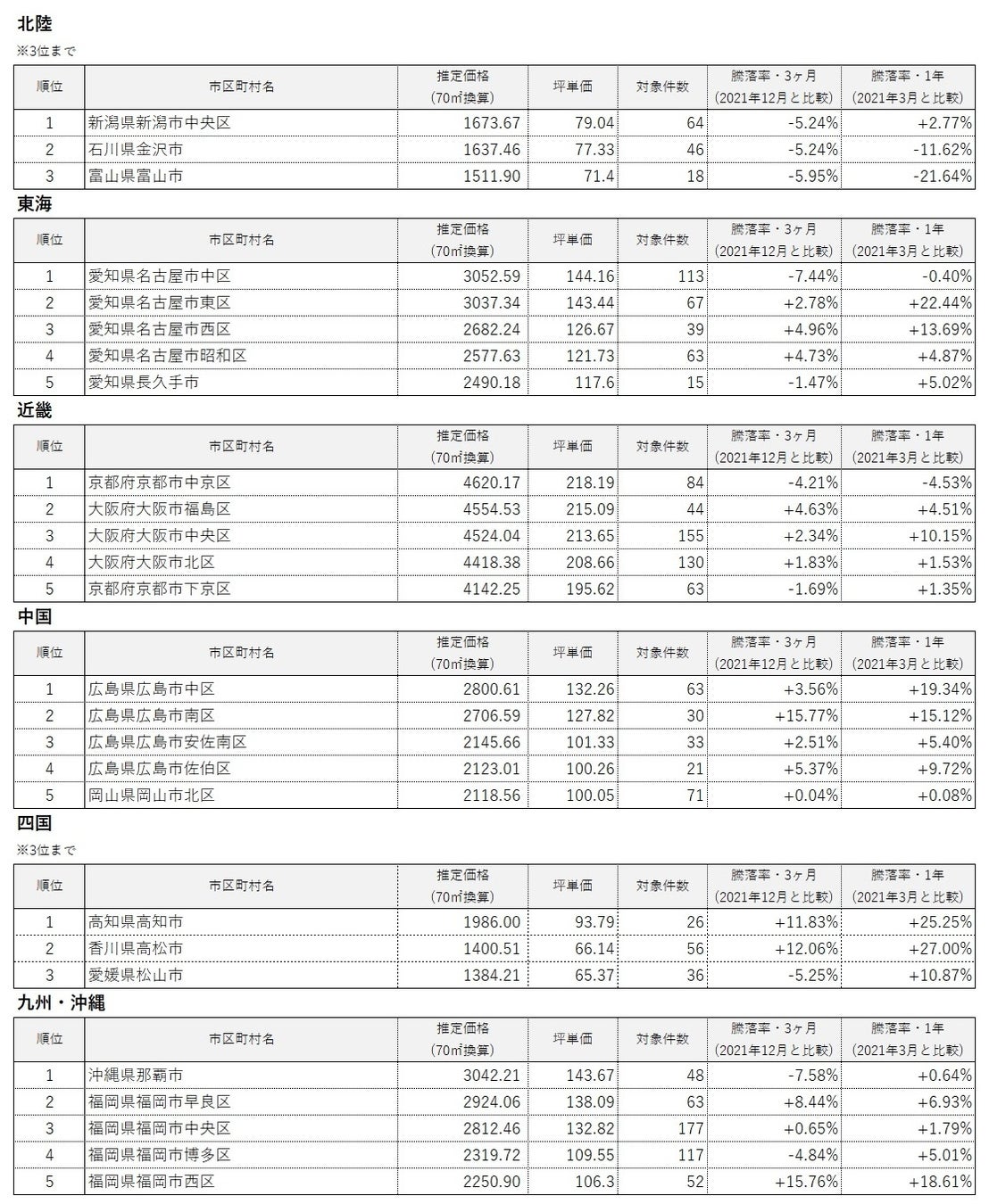 ・各エリアでの2022年3月の推定価格が1位の市区町村は以下の通り。