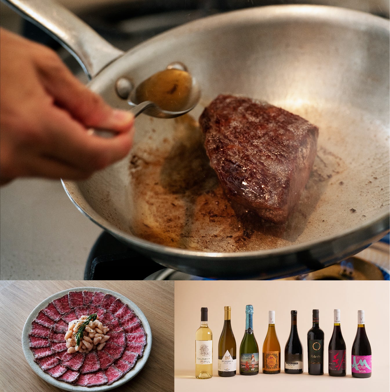 講師はローストビーフ専門店Taniversalを主宰する谷大輔氏と、生産数1万本以下の希少ワイン専門で輸入販売を行うGrapeFoxのメディ・ブケッシュ氏。シンプルな3つの調味料だけで旅先でも作りやすいアペロ(おつまみ)の作り方や低温調理したステーキの焼き方を学び、ワインの背景にあるストーリーを伺いながら、お料理とのペアリングを楽しみます。