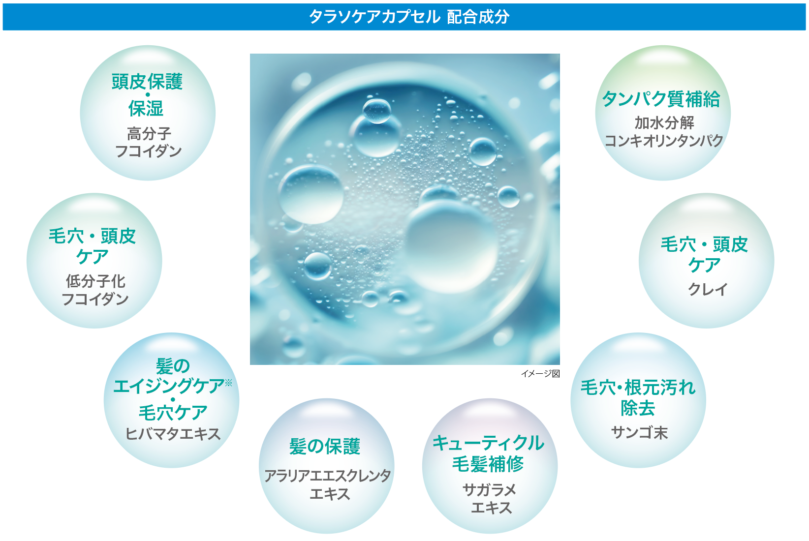 ガゴメ昆布から抽出した独自成分「ルプルプWフコイダン」と海の恵み成分を融合させた天然由来のタラソカプセル。日々の頭皮や髪の汚れをしっかり吸着、除去し、頭皮の環境を整えます。さらに頭皮と髪に保湿と美髪成分を与えて健康な髪に導きます。