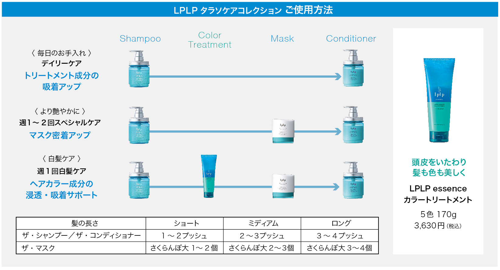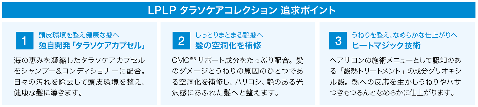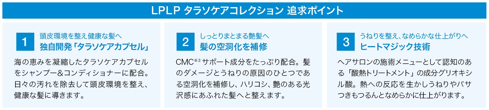 そんな LPLP 世代のお客様は白髪以外にも、うねりやパサつきといったお悩みを抱えており、頭皮と髪の研究を重ねる中で、大人髪は 35歳を超えると「髪の曲がり角」をむかえ髪や頭皮の悩みを多く抱えていることが分かったのです。LPLPはこれまで白髪を中心にお客様の悩みを解決してきましたが、大人の髪を根本的にケアし、より美しく輝かせるために、髪と地肌のトータルケアブランドとして進化します。その第一弾として、ハリ・コシ・圧倒的な艶を与える「タラソケアコレクション」を発売いたします。