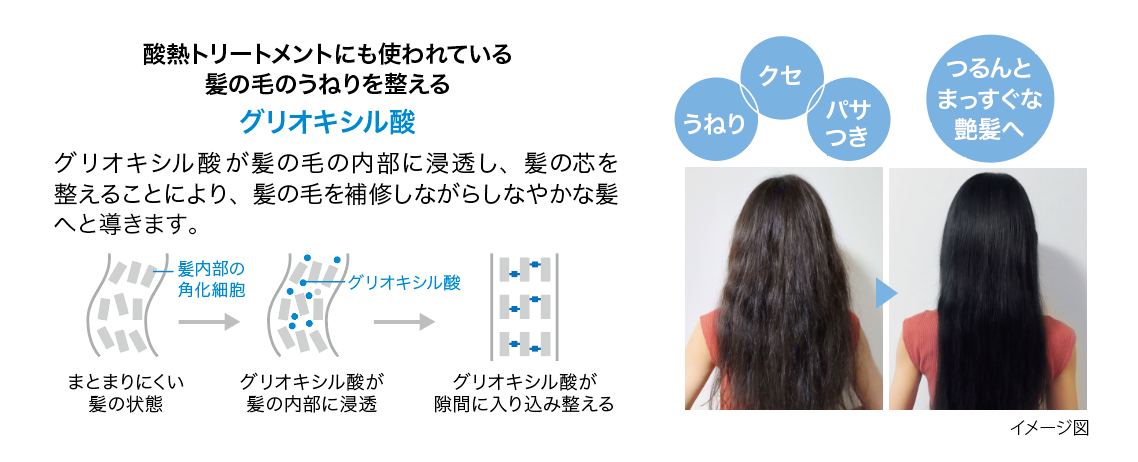プロ仕様の酸熱トリートメント成分「グリオキシル酸」を配合。縮毛矯正のメカニズムに着眼。極上の艶仕上がりを実現します。