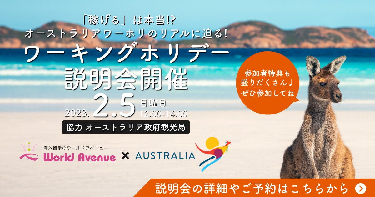 【海外出稼ぎで注目度急上昇のワーキングホリデー】円安・高時給で注目が集まるオーストラリアのワーキングホリデー制度を利用した留学プログラムを徹底解説する説明会を東京御茶ノ水ソラシティで2月5日開催。