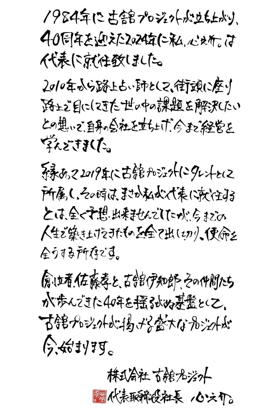 今年創立40周年を迎えた株式会社古舘プロジェクト(本社:東京都市ヶ谷)は、代表取締役社長に所属タレントでもある心之介。就任を発表