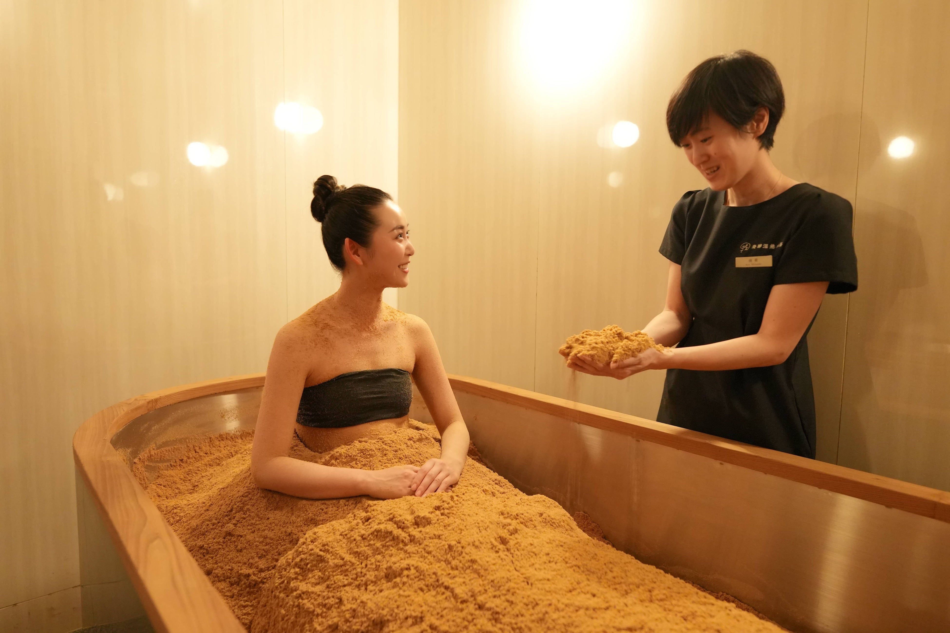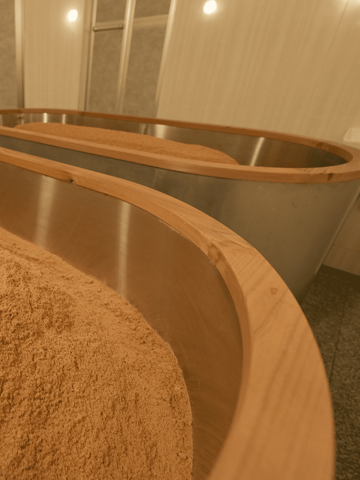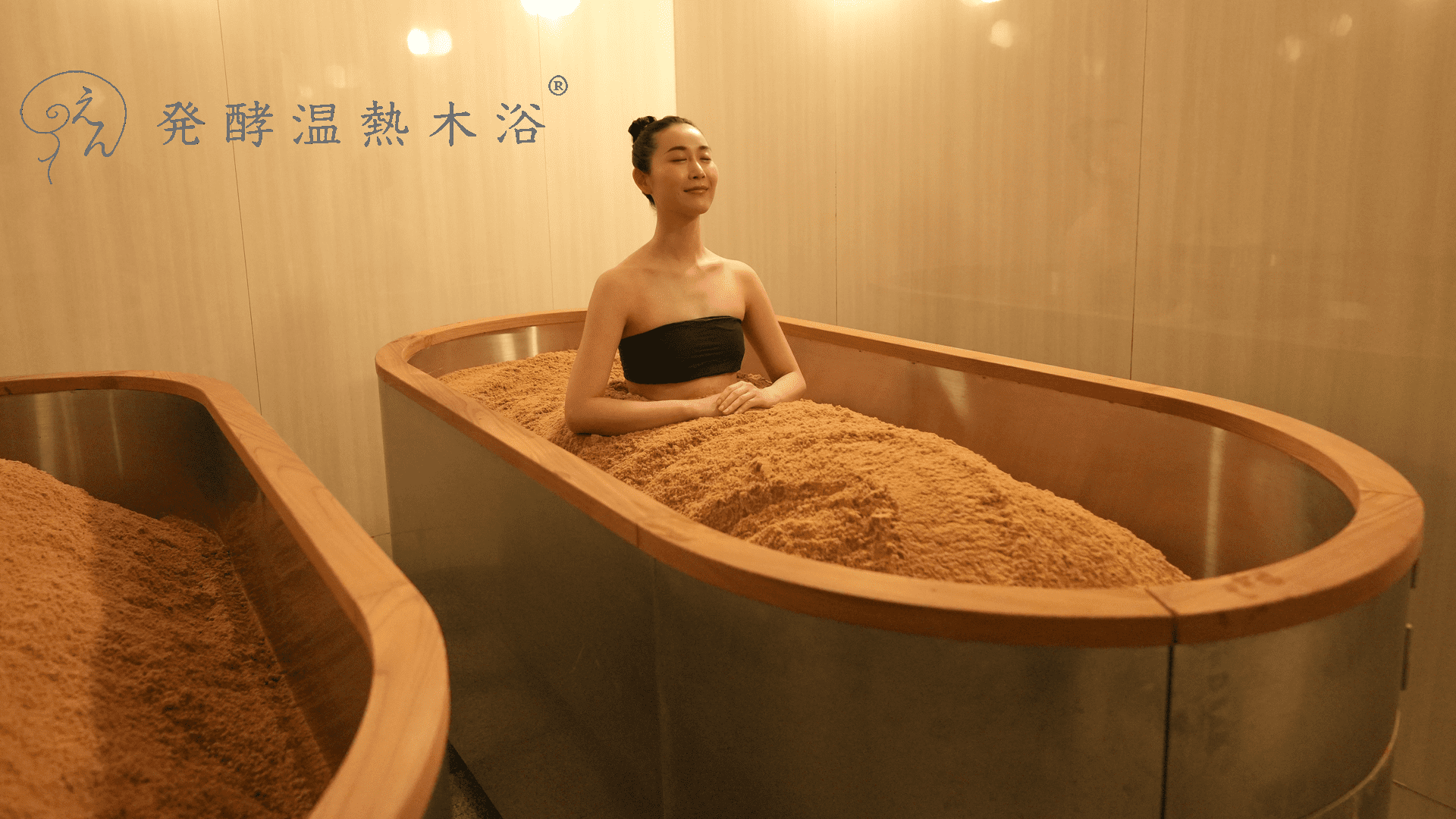 浴槽に敷き詰められたヒノキパウダーの中にからだ全体を沈め、深いリラクゼーション効果を得てからだを芯から温めます。