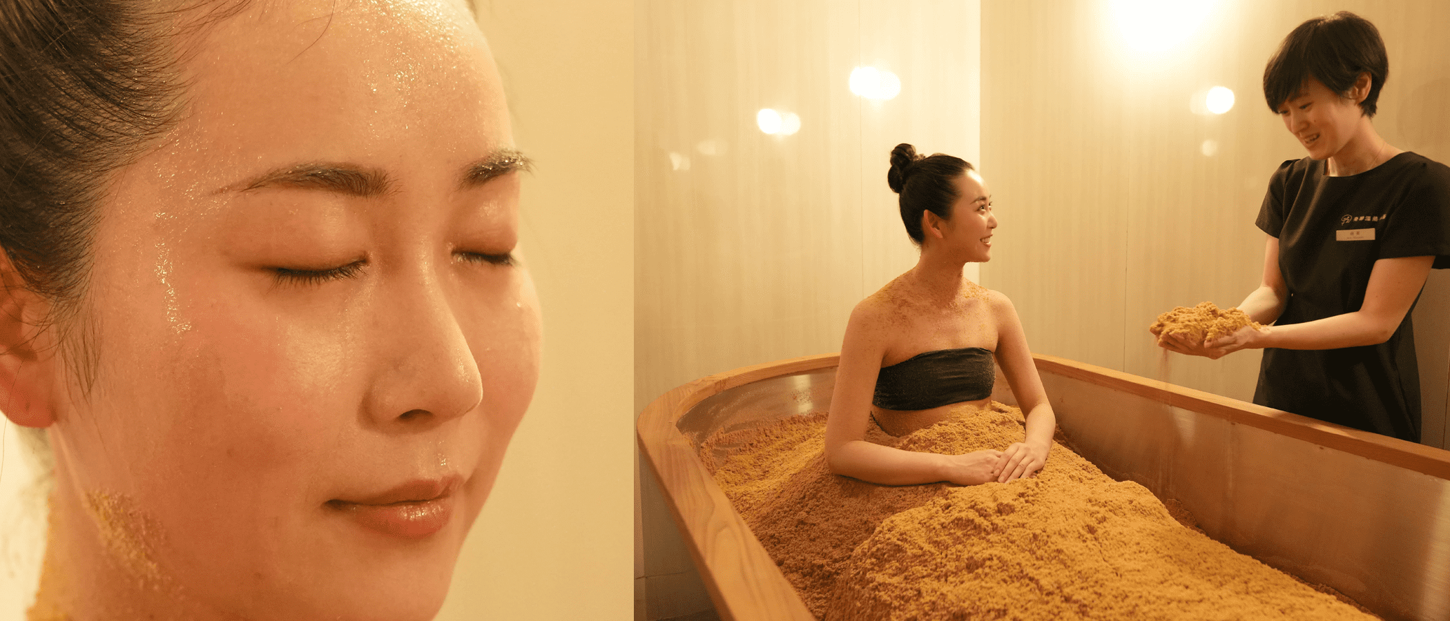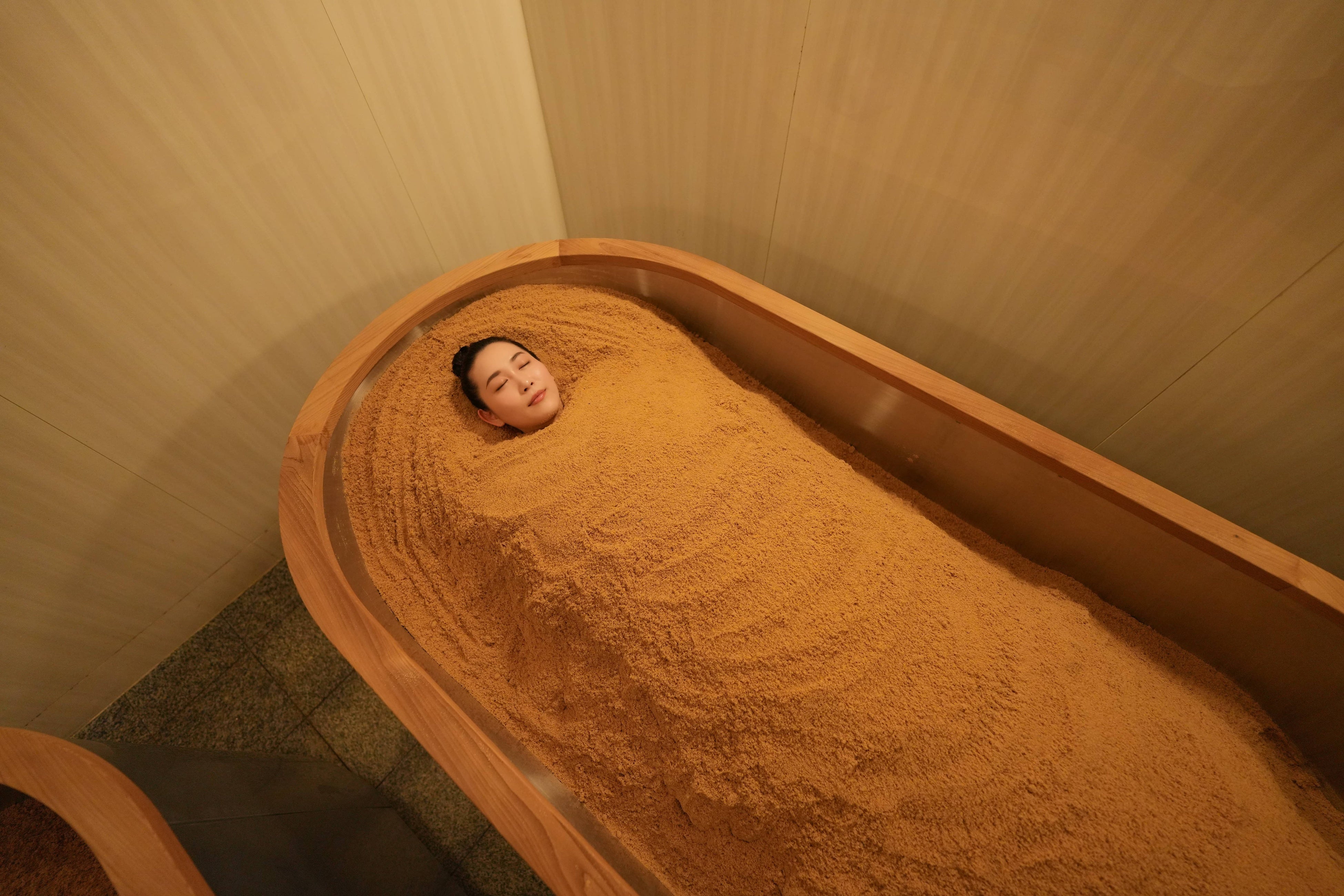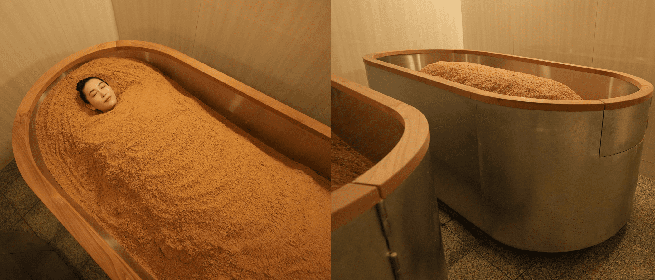 浴槽に敷き詰められたヒノキパウダーの中にからだ全体を沈め、深いリラクゼーション効果を得てからだを芯から温めます。