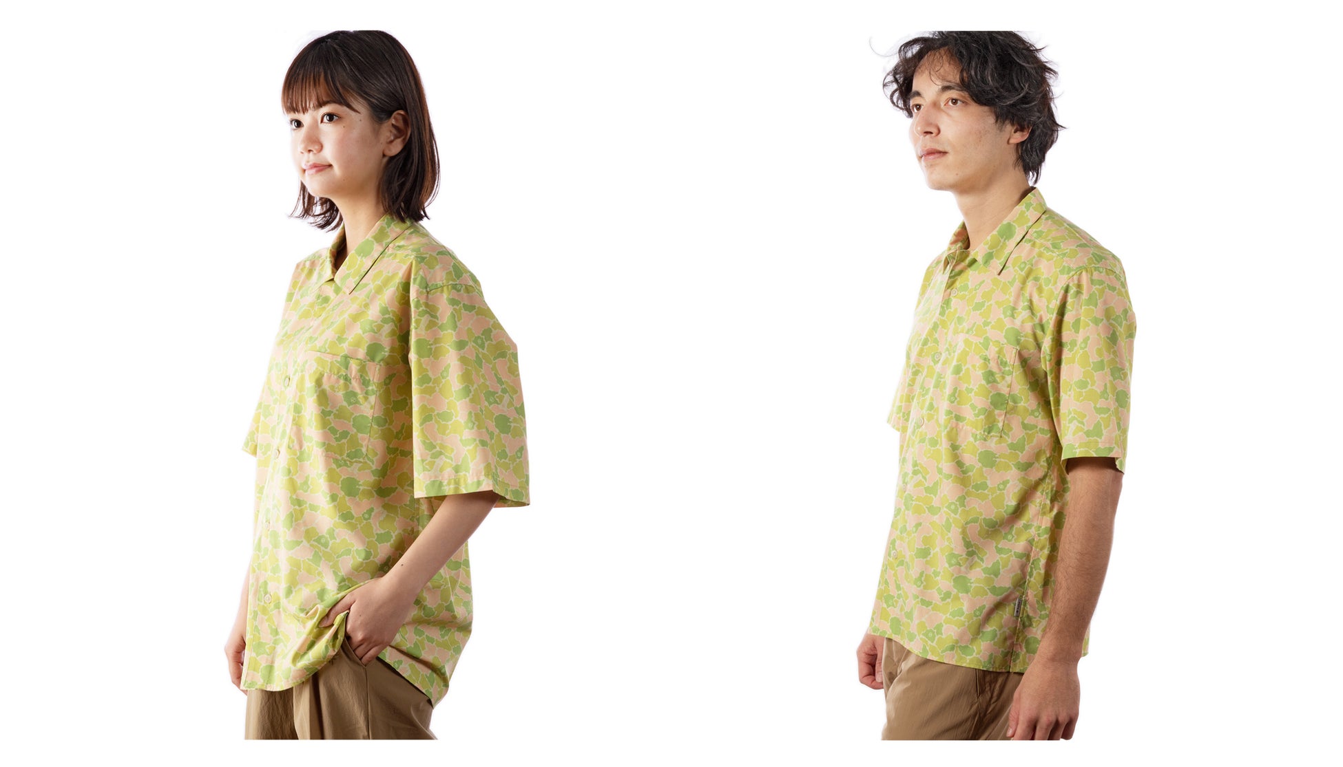 Foxfireオリジナルの「フィッシュアイカモフラージュ」柄をベースに、トトロやまっくろくろすけ達がところどころに配置された、コラボレーション仕様の特別な「フィッシュアイ・トトロカモ」柄を採用。ポリエステルが高混率でありながらコットンライクな風合いで、乾きも早い、Foxfire定番のシャツ素材にプリント柄を施しました。メンズサイズベースのラフなオープンカラーデザインで、女性が着用するとオーバーサイズなゆとり感が今風のユニセックスシャツになります。