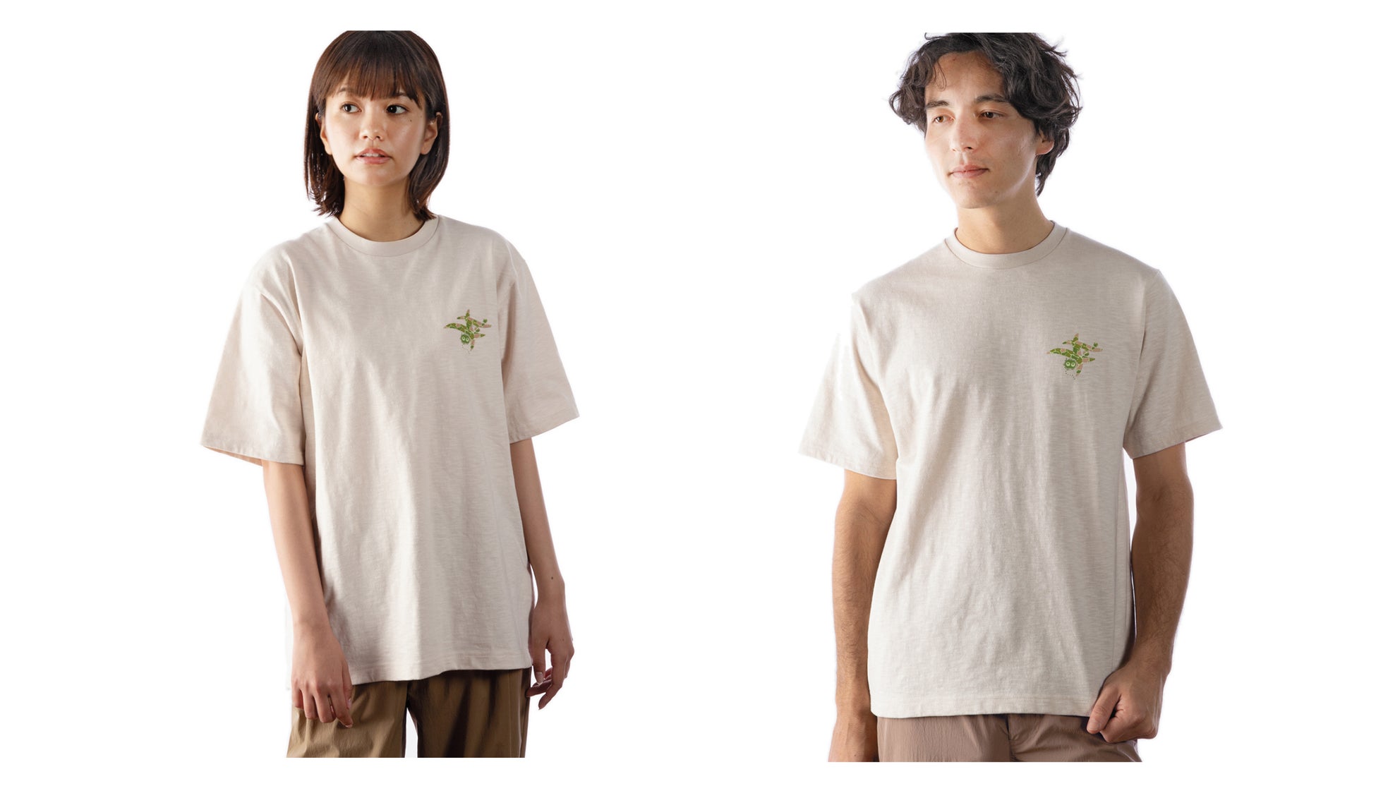表側にコットンのスラブ糸を、裏面にポリエステル糸を使用した素材のTシャツ。スラブのナチュラルな風合いが独特の凹凸感を生み、肌面にポリエステルを配している為、厚みがありながらも肌離れが良く着心地に優れています。コラボレーション仕様の特別な「フィッシュアイ・トトロカモ」柄カラーのトライロッドマークに、ふんわりと漂うまっくろくろすけが可愛らしいプリント柄を左胸に配置。メンズサイズベースでゆったりしたサイズ感のユニセックス展開です。
