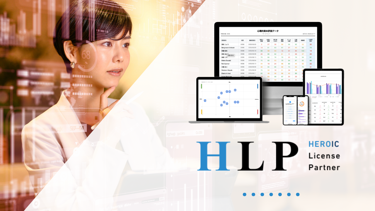 心理的資本の状態を可視化し、組織・人材のリスクと伸びしろを発見する「HEROIC(ヒロイック)診断」の活用ライセンスを保有するパートナー制度です。人事コンサルタントや社内担当者などが、データに基づいた組織活性化や人材育成を行うための専門的なノウハウを共有しています。
