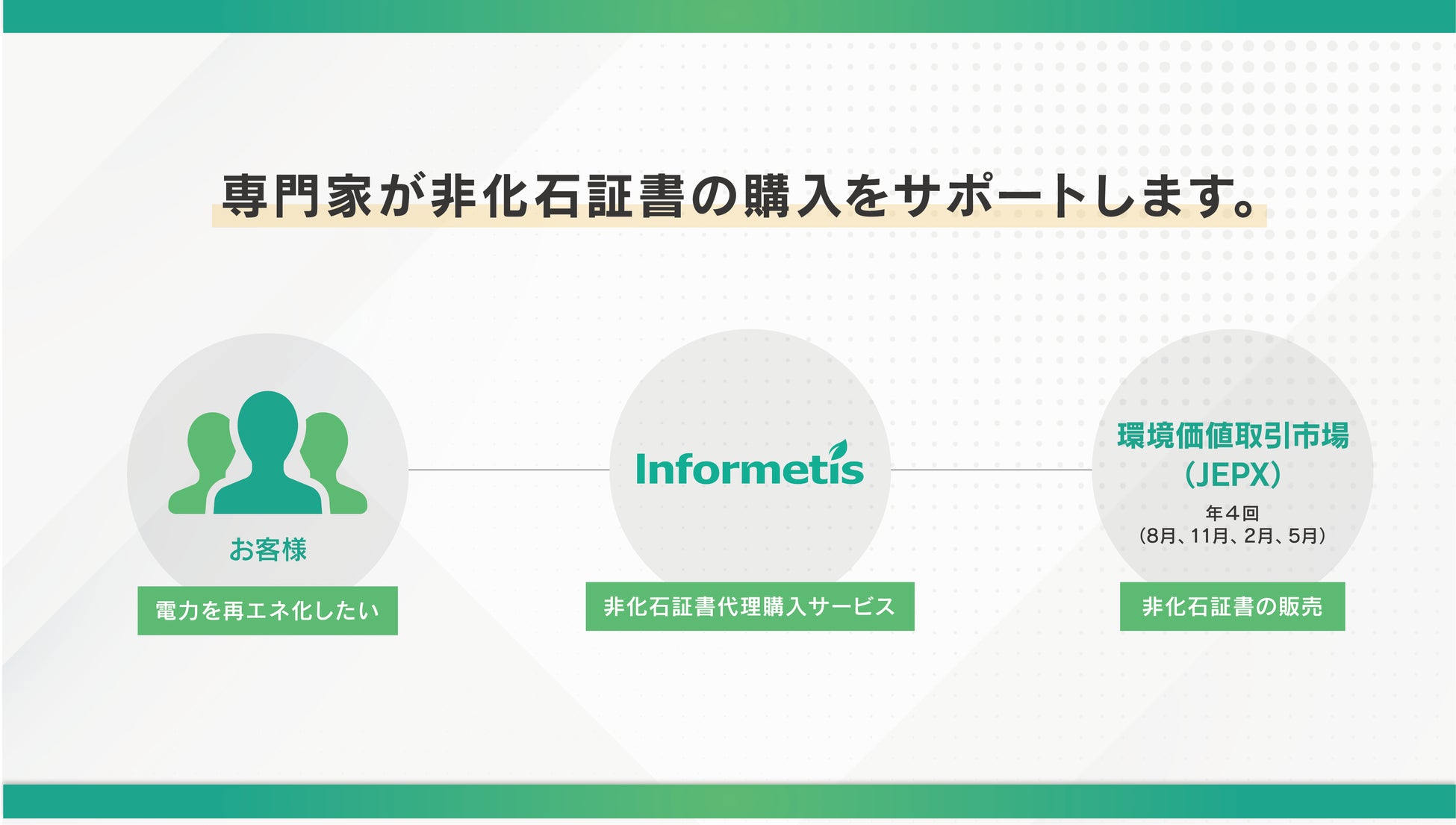 インフォメティス株式会社(本社:東京都港区、代表取締役:只野 太郎、以下「インフォメティス」)は、企業の脱炭素経営を支援する「非化石証書代理購入サービス」の提供を開始します。