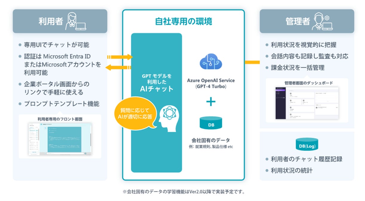 本サービスは Microsoft社 の Azure OpenAI Service を基盤に採用しており、独自のインターフェースを通じて、ChatGPT をはじめとする最先端の生成 AI 技術を、情報漏洩やセキュリティのリスクを心配することなく容易に導入し活用することが可能になります。