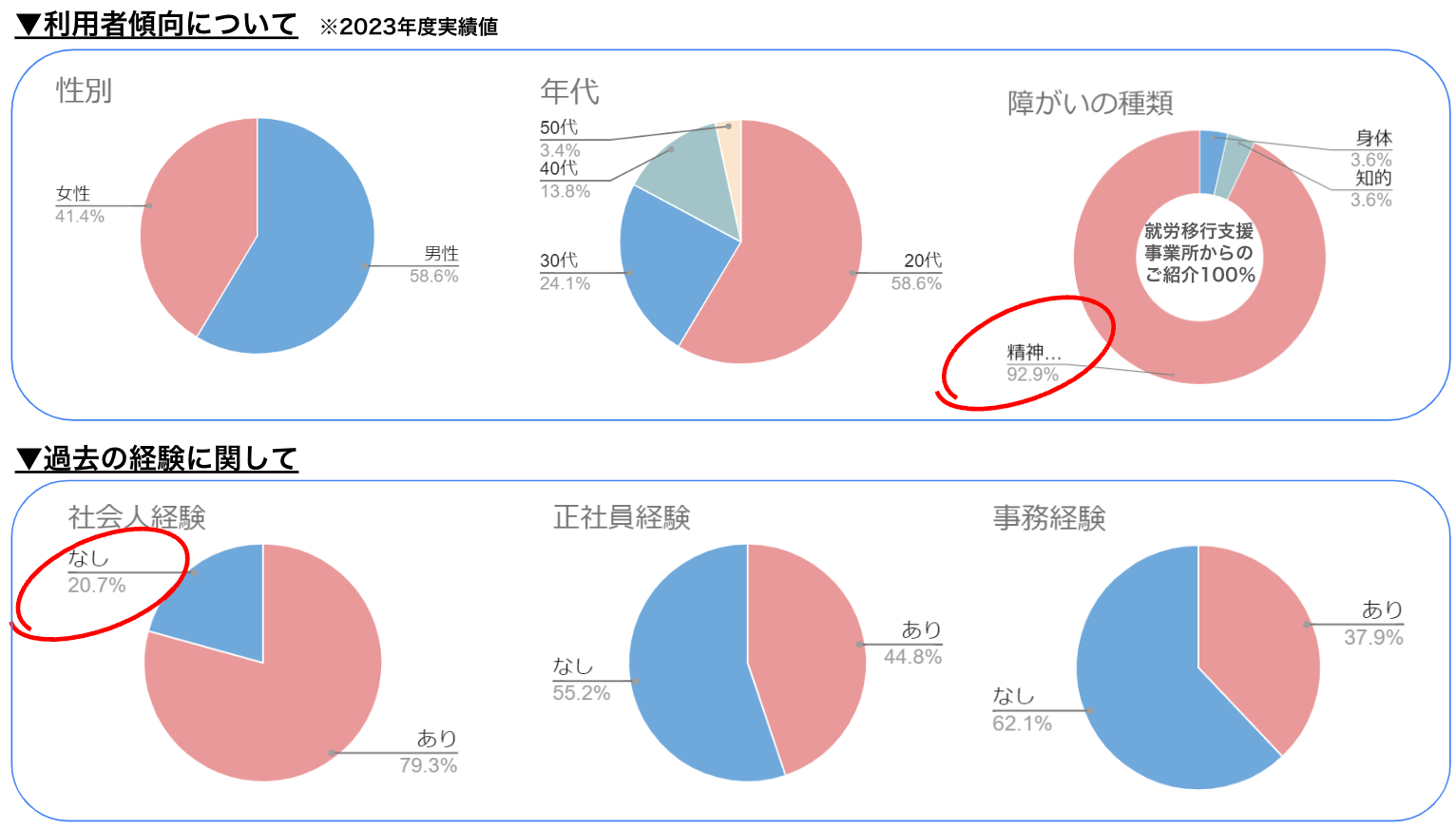 なお、実際に利用されている方の傾向値としては、精神障害のある方の比率が圧倒的に多いものの、性別や年齢、過去の仕事経験などは一切関係なく、皆様が「安心」「安定」して勤務できるよう設計し、障害者の成長と活躍にむけたサポートと企業の生産性および業績向上に繋げるよう取り組んでいます。