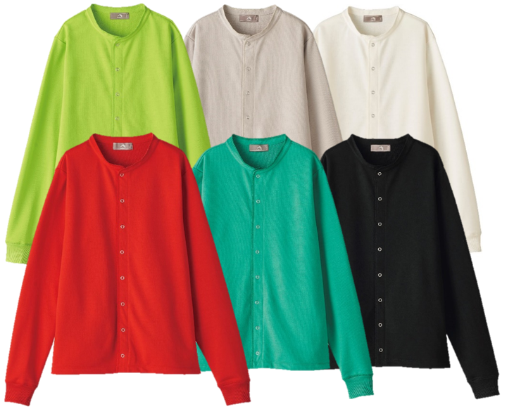 上段左から:ピスタチオ、グレージュ、アイボリー 下段左から:レッド、グリーン、ブラック サイズ:M~LL
