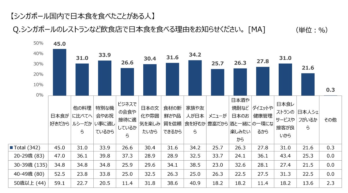 本調査を通して、シンガポール全体で日本食の喫食経験率が非常に高いことが分かりました。また、日本食を食べる理由として「日本食が好き」と回答した割合は全体の45.0%に達し、各世代においても高い割合を示しています。