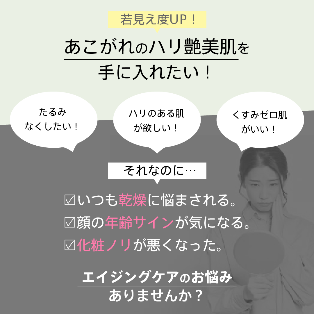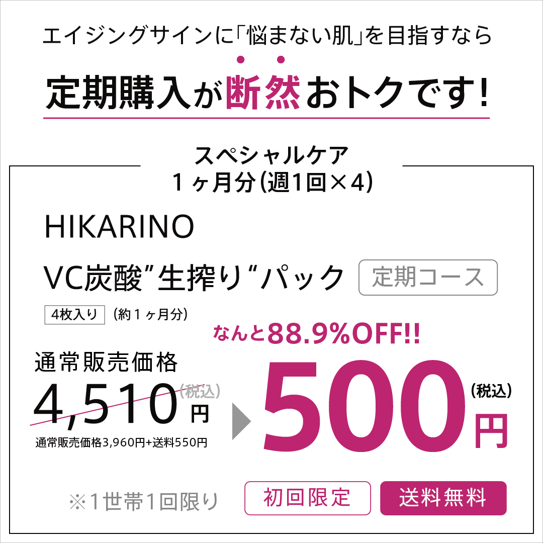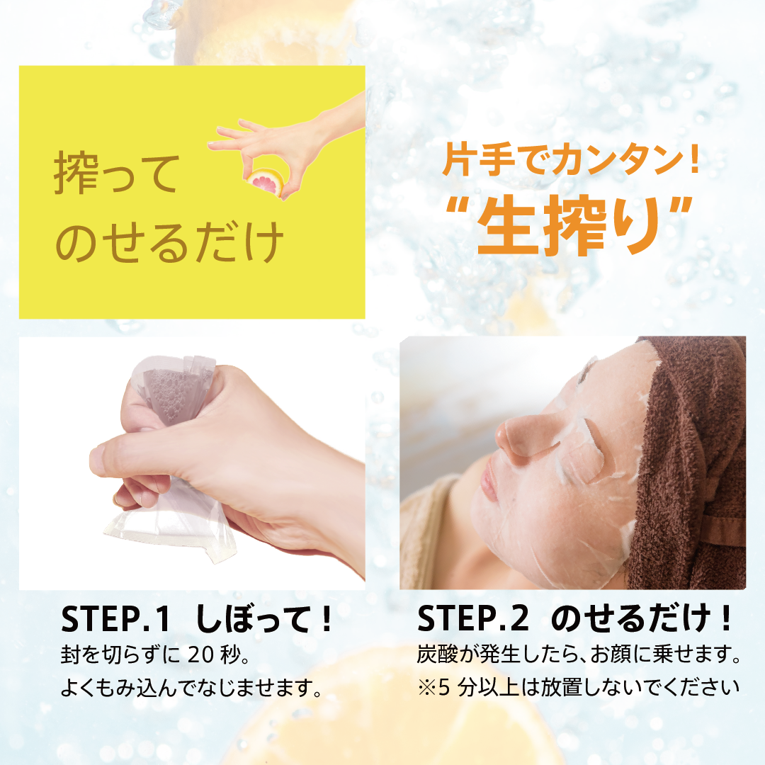 エイジングサインの3大悩み、SST(シミ・シワ・たるみ)をターゲットにした、その場で搾るVC炭酸”生搾り“パック(4枚入/約1ヶ月分)を、初回限定キャンペーン500円(税込)でご購入いただけます!