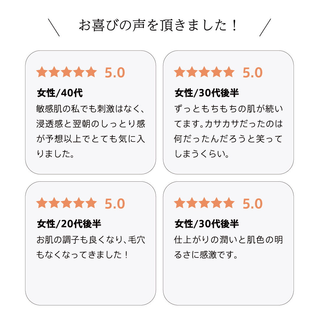 敏感肌の私でも刺激はなく、浸透感と翌朝のしっとり感が予想以上でとても気に入りました。