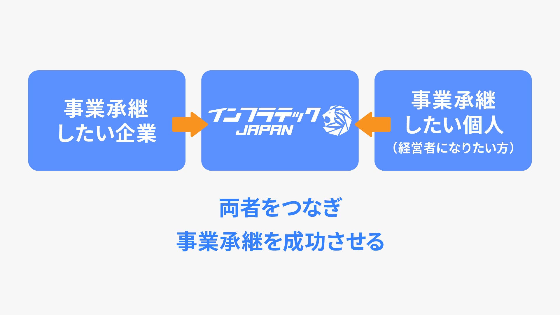 インフラテック・ジャパンは、「事業承継したい企業」と「事業承継したい個人(経営者になりたい方)」をつなぐことで、こうした事業承継問題の解決に貢献して参ります。