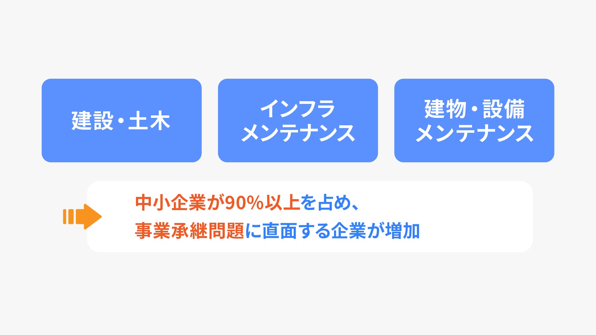 「建設・土木」、「インフラメンテナンス」、「建物・設備メンテナンス」の分野は、中小企業が90%以上を占め、経営者の高齢化、経営後継者の不在などにより、事業承継問題に直面するケースが増加しています。