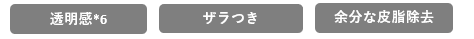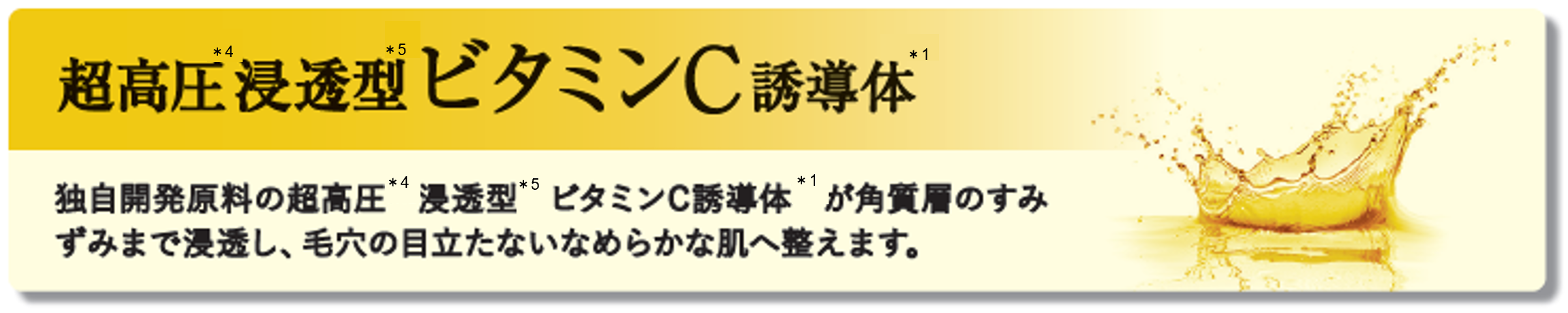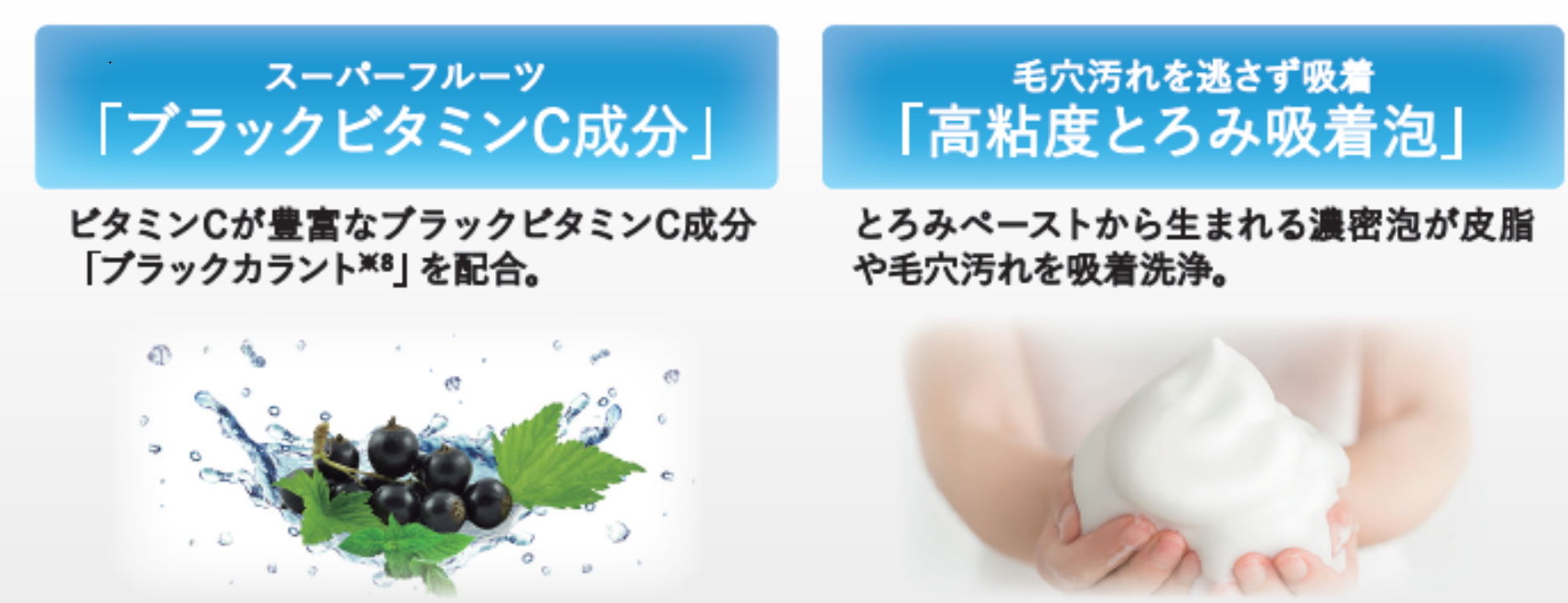 *1超高圧処理したテトラヘキシルデカン酸アスコルビル (保湿成分)*2吸着成分 *3パパイン(洗浄成分)*4超高圧加工処理装置を用いた原料 *5角質層まで *6古い角質や汚れをおとすことによる *7海シルト、パール(保湿成分)*8クロフサスグリ果実エキス(保湿成分)