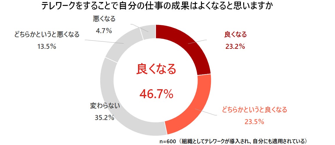 テレワークが適用されている人の約半数(46.7%)が”テレワークによって仕事の成果が良くなる”と回答しています。