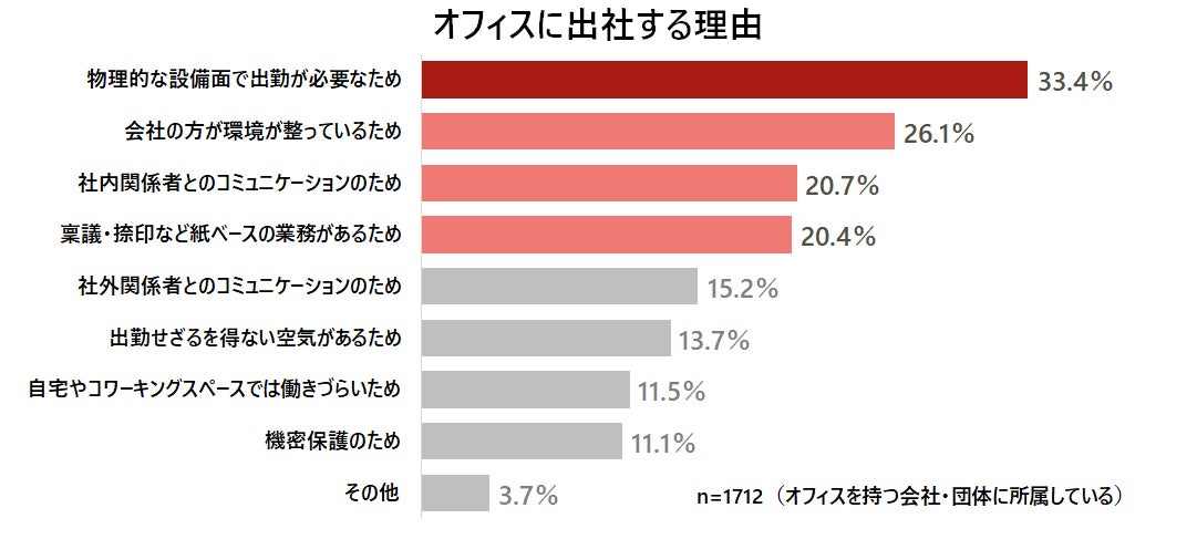 「オフィスに出社する理由」は、”物理的な設備面で出勤が必要なため(33.4%)”が最も高く、”会社の方が環境が整っているため(26.1%)”、”社内関係者とのコミュニケーションのため(20.7%)”、”稟議・捺印など紙ベースの業務があるため(20.4%)”が次いで高い結果となりました。