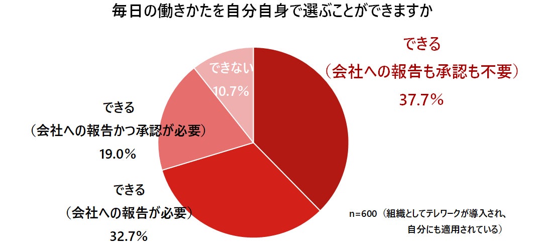 ”テレワークが適用されている”と回答した人(n=600)の約9割(89.3%)が、所属する会社・団体の制度として、“出社かテレワークか自分自身で選ぶことができる”と回答しました。