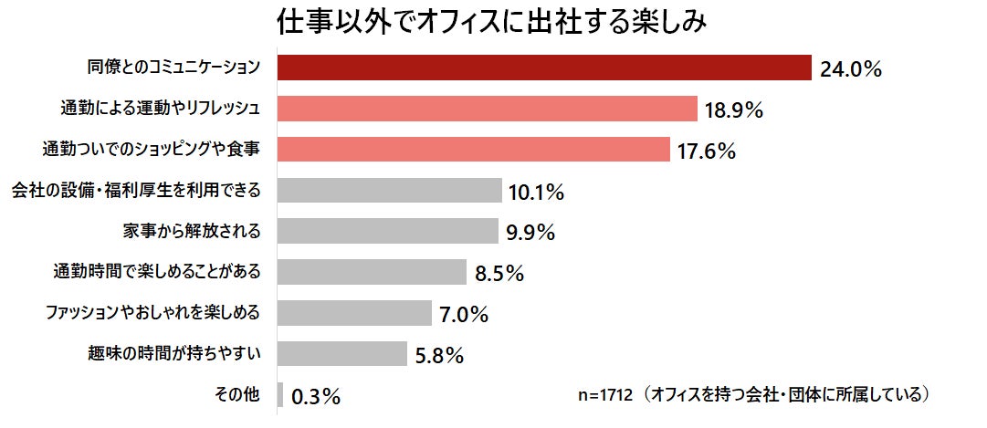 「仕事以外でオフィスに出社する楽しみ」については、”同僚とのコミュニケーション(24.0%)”、”通勤による運動やリフレッシュ(18.9%)”、”通勤ついでのショッピングや食事(17.6%)”が上位にあがる結果となりました。