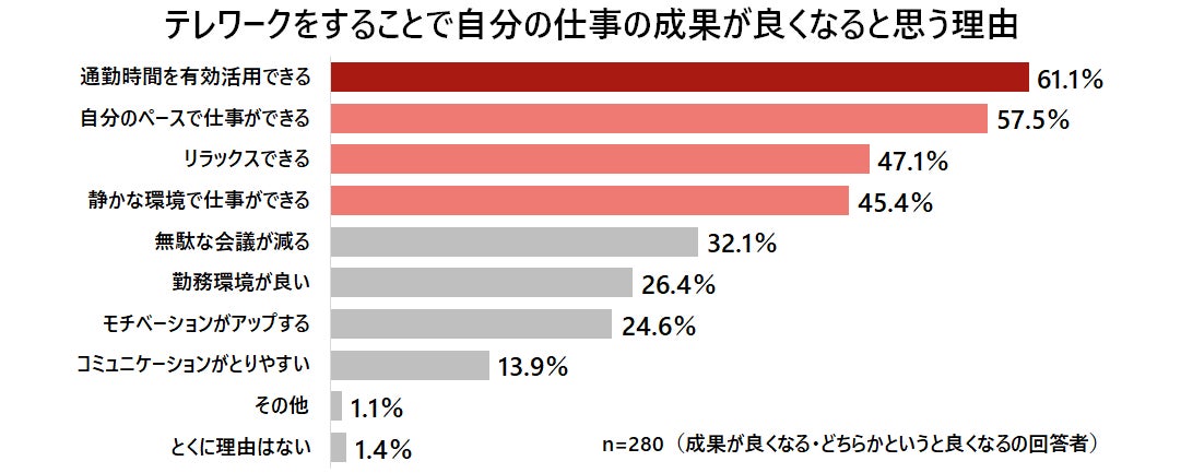その理由として、”通勤時間を有効活用できる(61.1%)”が最も高く、”自分のペースで仕事ができる(57.5%)”、”リラックスできる(47.1%)”、”静かな環境で仕事ができる(45.4%)”が次いで高い結果となりました。