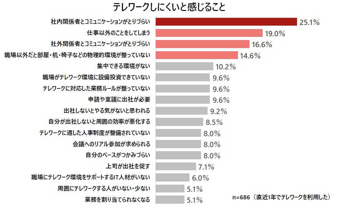 今回の調査で、直近1年間でテレワークをした人(n=686)の、約4割(40.1%)が「直近1年間でテレワークを利用しにくいと感じたことがある」と回答しています。その理由は、”社内関係者とコミュニケーションがとりづらい(25.1%)”が最も高く、”仕事以外のことをしてしまう(19.0%)”、 ”社外関係者とコミュニケーションがとりづらい(16.6%)”などがあげられました。コミュニケーションはテレワークの課題である一方、コミュニケーションのとりやすさにオフィスの存在価値があることも明らかになりました。