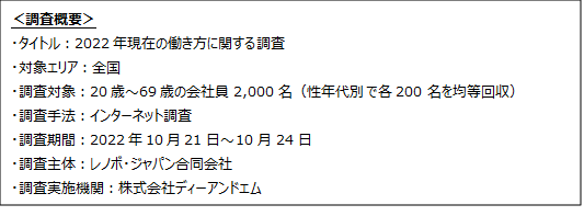 | <調査概要> ・タイトル:2022年現在の働き方に関する調査 ・対象エリア:全国 ・調査対象:20歳~69歳の会社員2,000名(性年代別で各200名を均等回収) ・調査手法:インターネット調査 ・調査期間:2022年10月21日~10月24日 ・調査主体:レノボ・ジャパン合同会社 ・調査実施機関:株式会社ディーアンドエム |