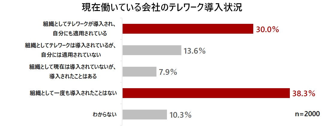 所属する会社・団体の制度について調査したところ、”組織としてテレワークが導入され、自分にも適用されている”と回答した人は全体の3割(30.0%)だったのに対し、”組織として一度も導入されたことはない”と回答した人は全体の約4割(38.3%)という実態が明らかになりました。
