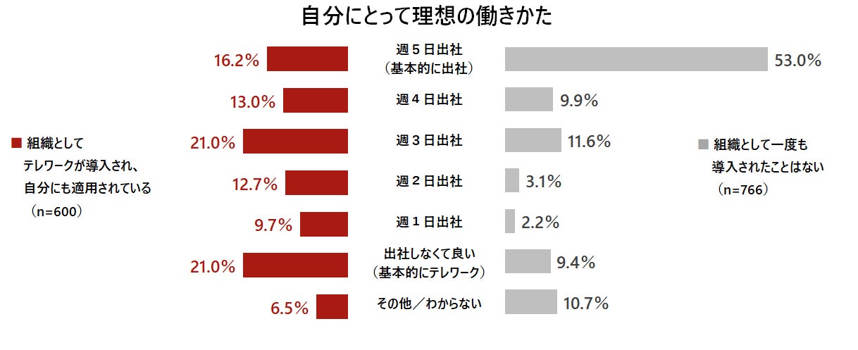 理想の働き方を調査したところ、下図の通り、テレワークが適用されている人は、”完全テレワーク(週0日出社)”から”週5日出社”まで多様な回答がみられました。一方で”組織として一度もテレワークが導入されたことがない”人(n=766)の約半数(53.0%)が、”週5日出社”を理想の働き方とする結果になりました。