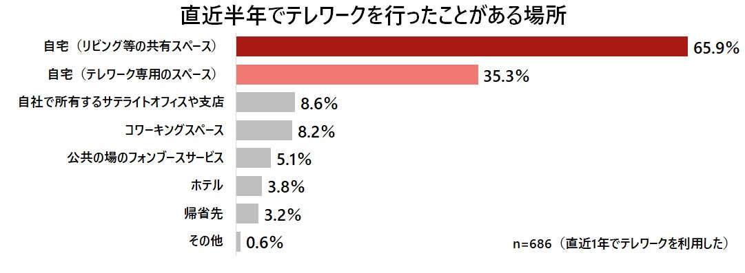 オフィス以外の働く場所として、テレワークの実施場所についても調査を行いました。直近1年間でテレワークをした人(n=686)に、テレワークの実施場所を調査したところ、”自宅(リビング等の共有スペース)”が65.9%と最も多く、次いで”自宅(テレワーク専用のスペース)が35.3%という結果になりました。自宅以外の場所はそれぞれ1割にも満たず、実際には自宅以外をテレワークの実施場所として選択する人は少ないという現状が分かりました。
