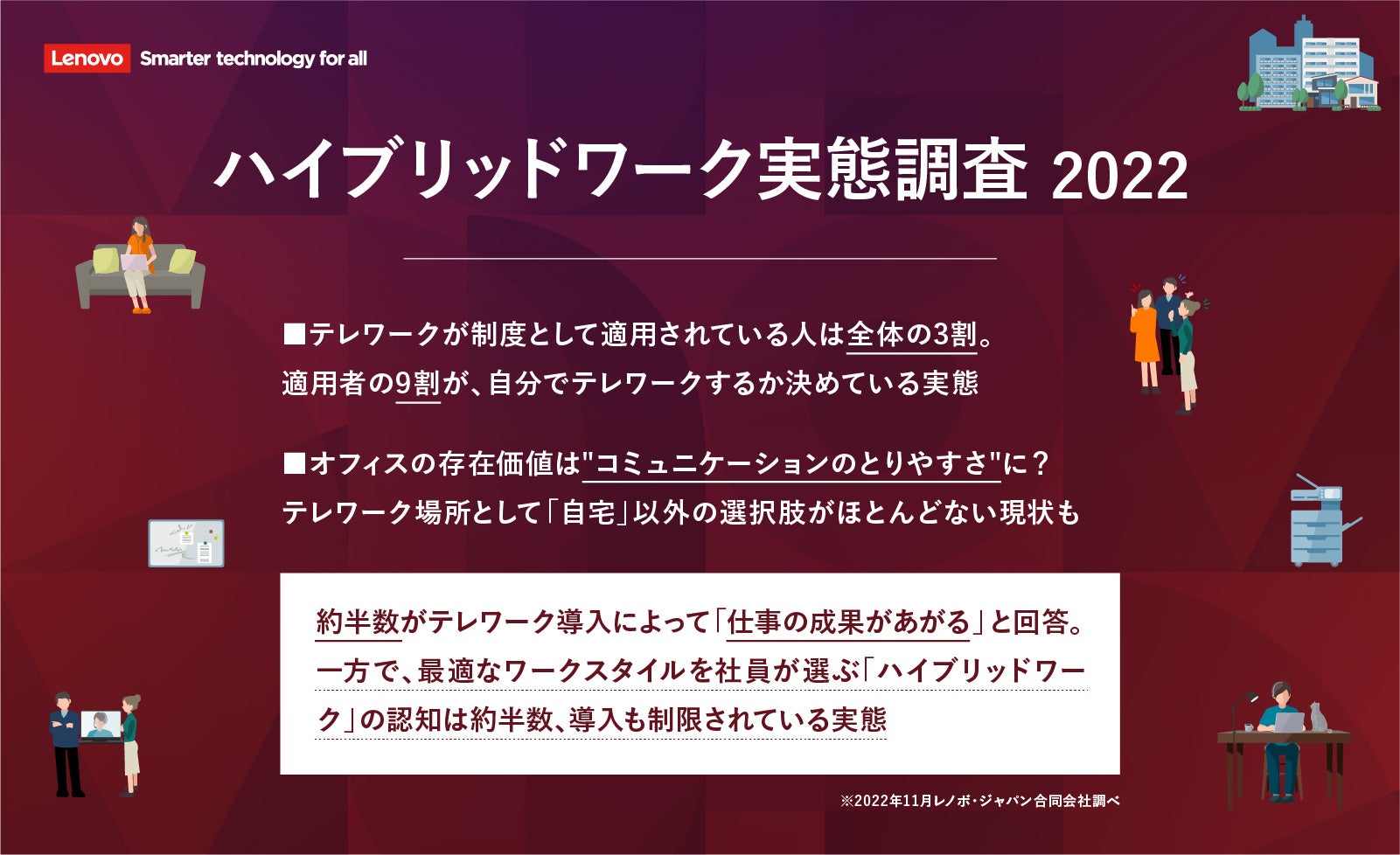 しかし、新型コロナウイルスによるパンデミックをきっかけに人々の働き方は少しずつ多様になってきています。レノボでは、制度や場所にとらわれず、自分に合った多様性のある働き方を自らが選択できるよう、これからもハイブリッドワーク推進の取り組みを進めて参ります。